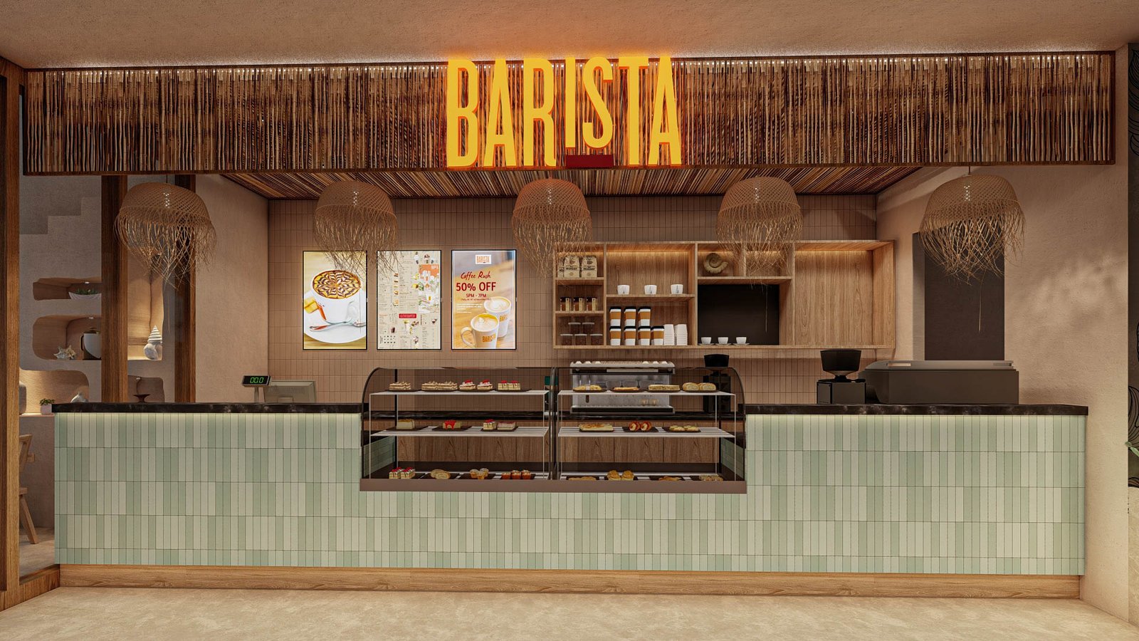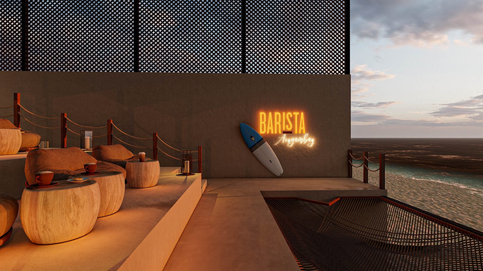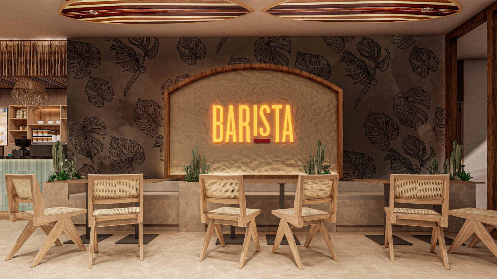 Facing the iconic Arugambay beachfront, Barista’s interior design blends the brand’s warm, contemporary identity with the natural textures and colors of the surrounding coastline. The design is crafted to feel like a seamless extension of the beach.