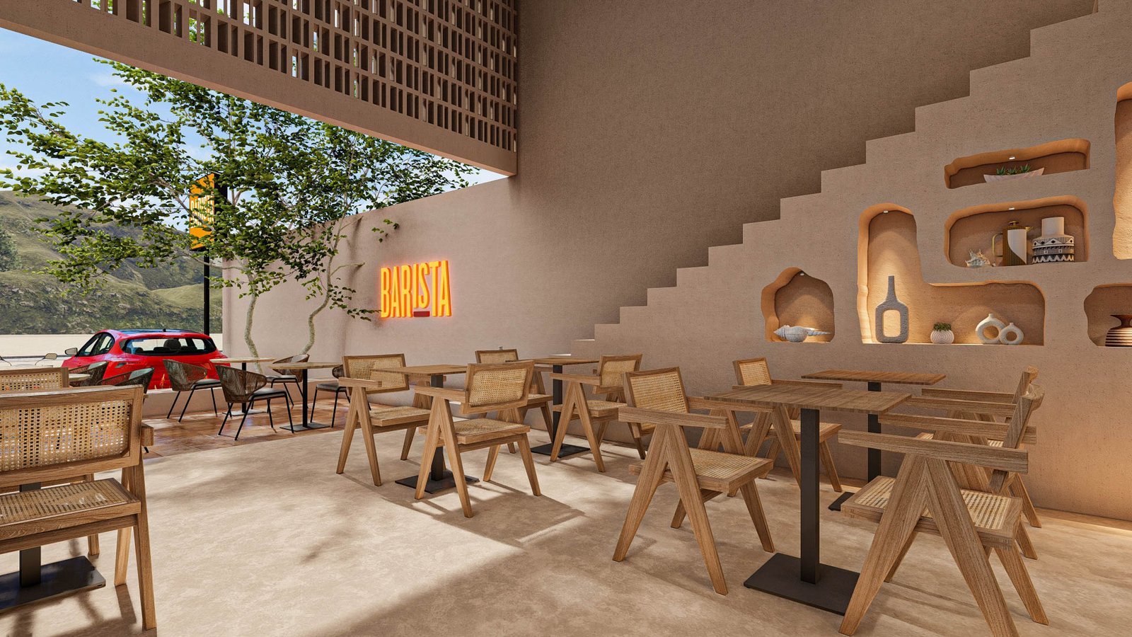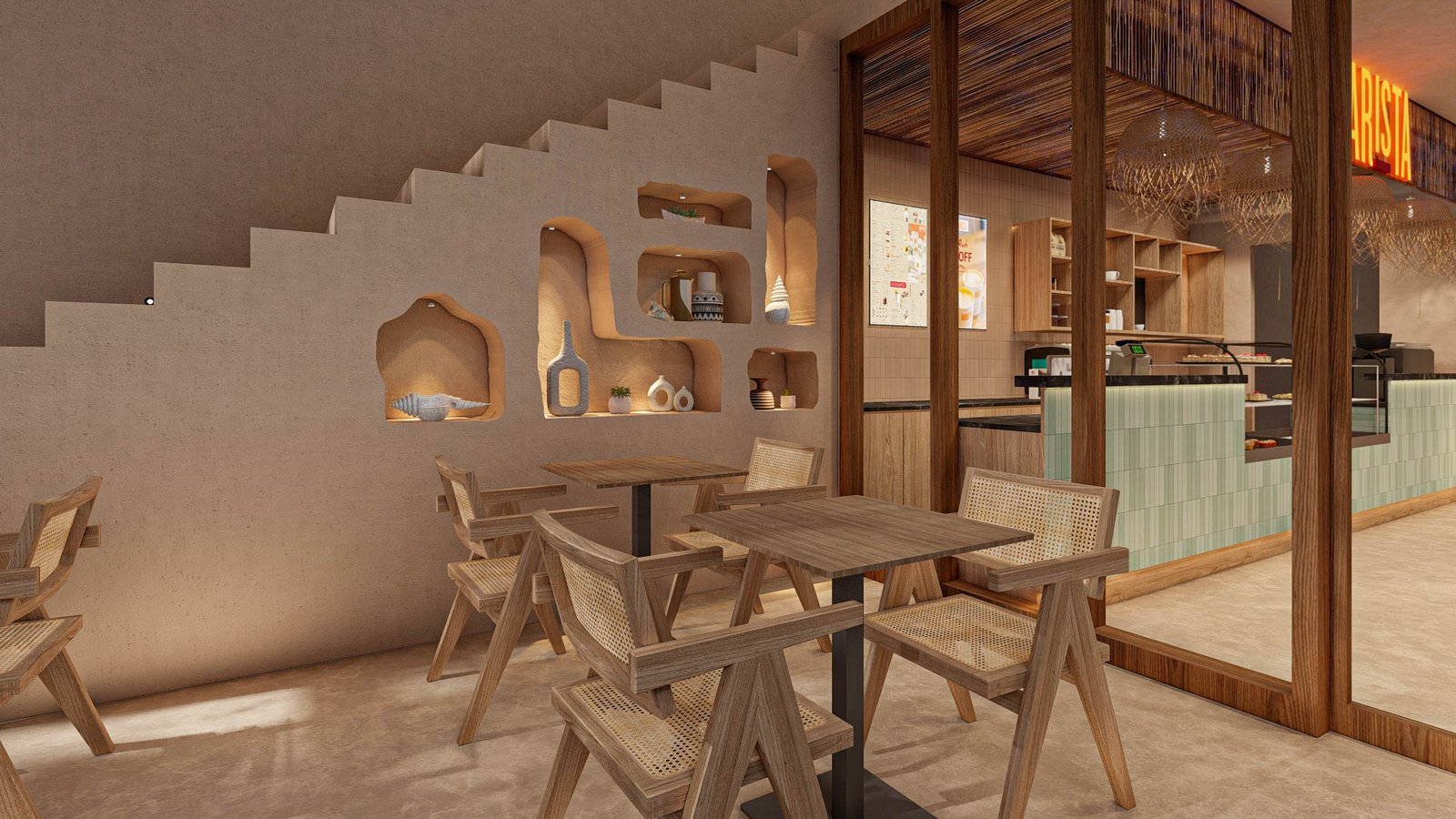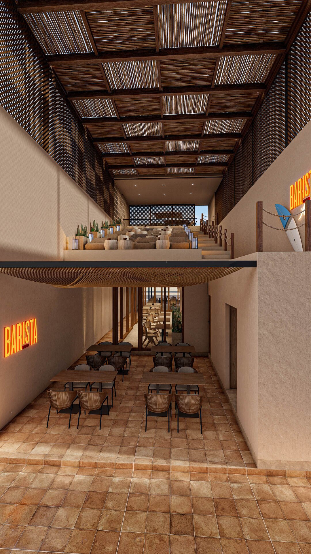 The entire space is built on a palette inspired by sand dunes, driftwood, seashells, and sunlit surf. Smooth beige walls, textured terracotta flooring, and woven natural materials create a grounded, earthy calm. The environment is intentionally warm, welcoming, and laid-back—perfect for surfers, travelers and locals seeking a tranquil beachside coffee break.