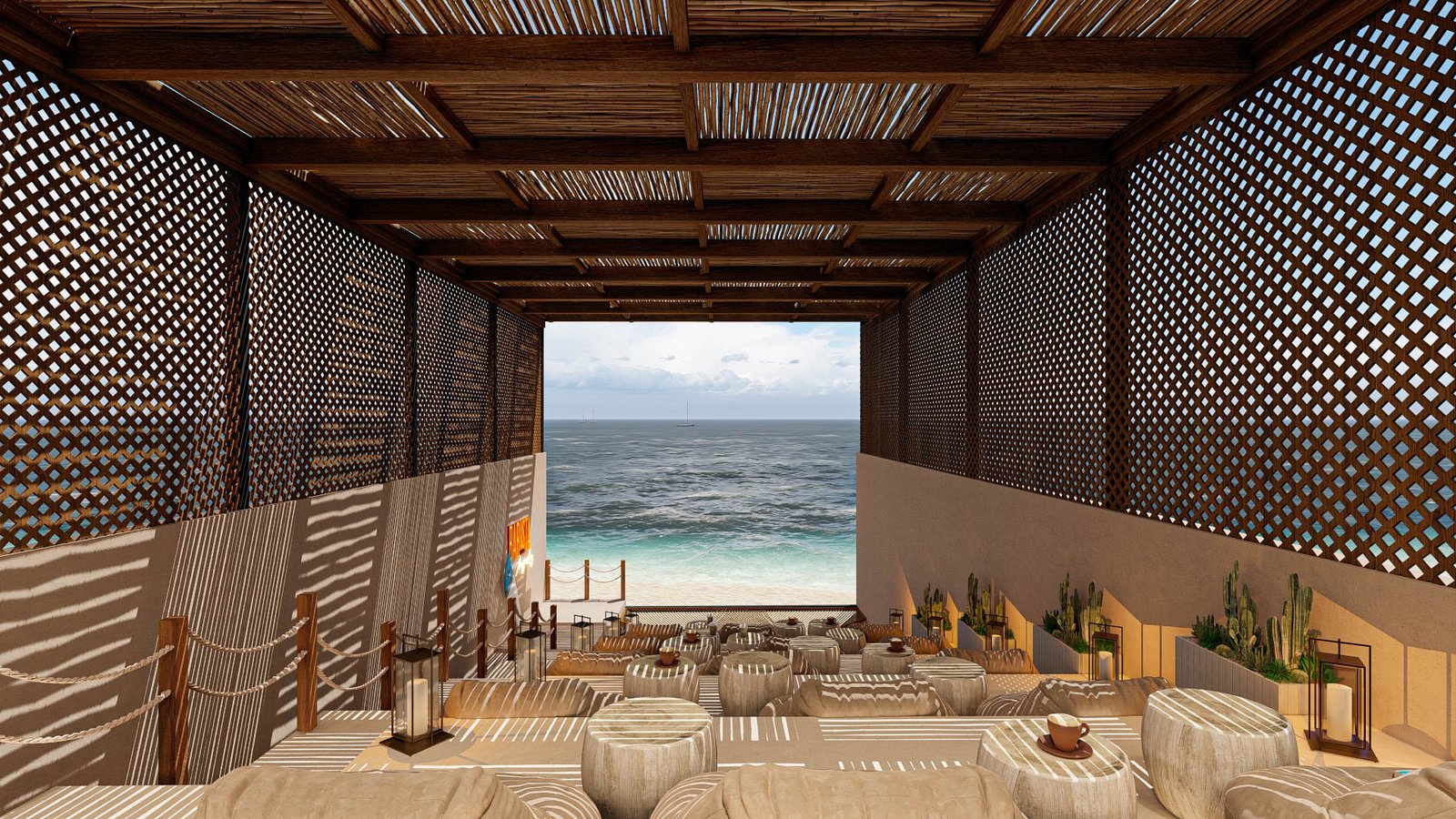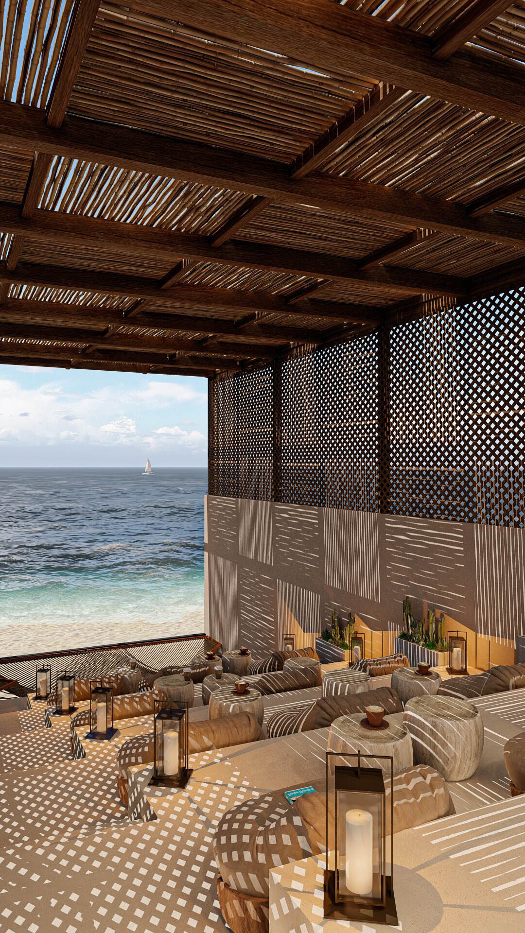 Lighting is soft and golden, mimicking the warm glow of sunrise on the shore. Shadows from greenery and latticed structures move gently across surfaces throughout the day, enhancing the feeling of being connected to the outdoors.