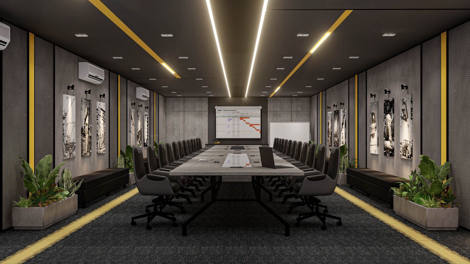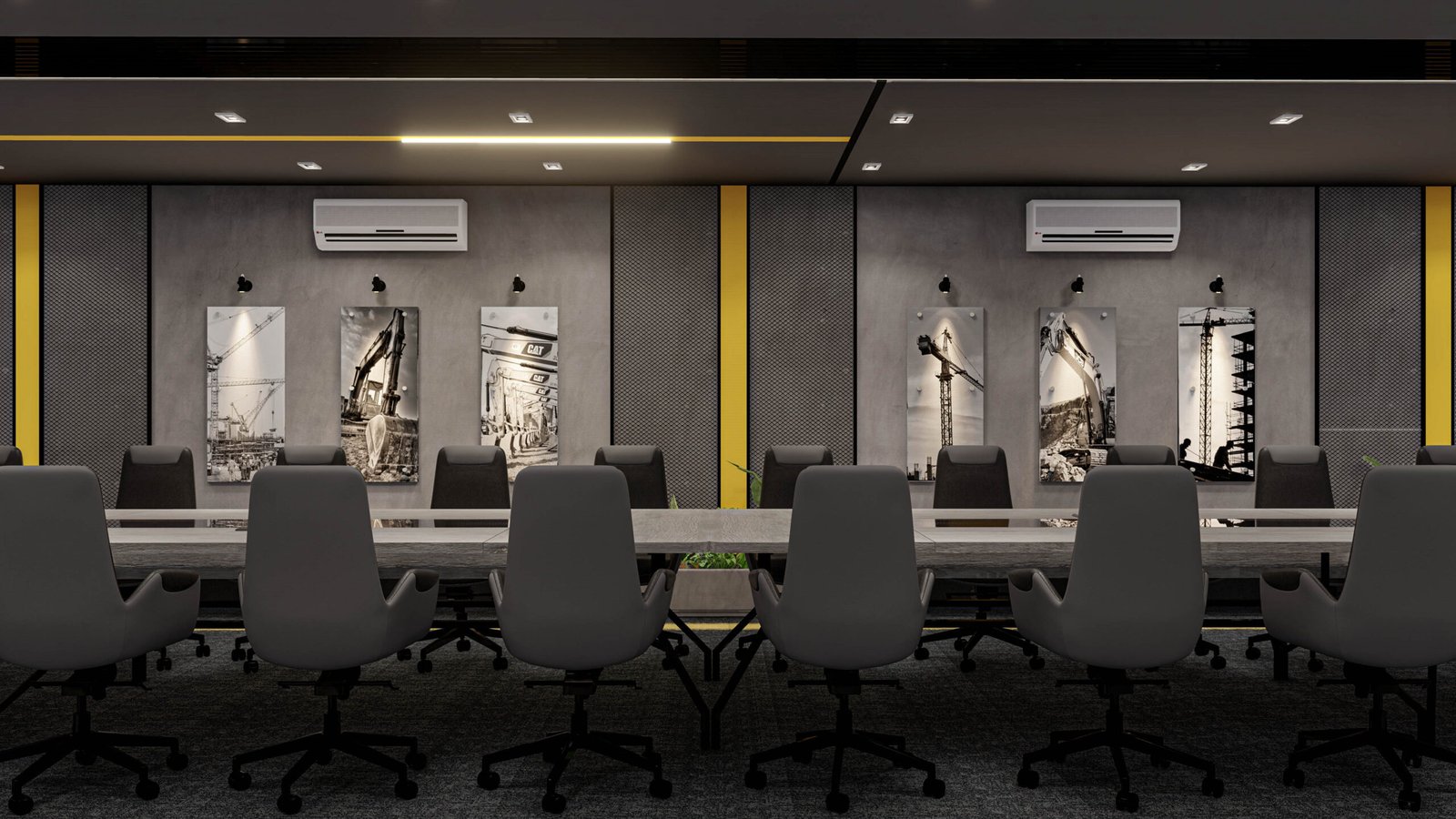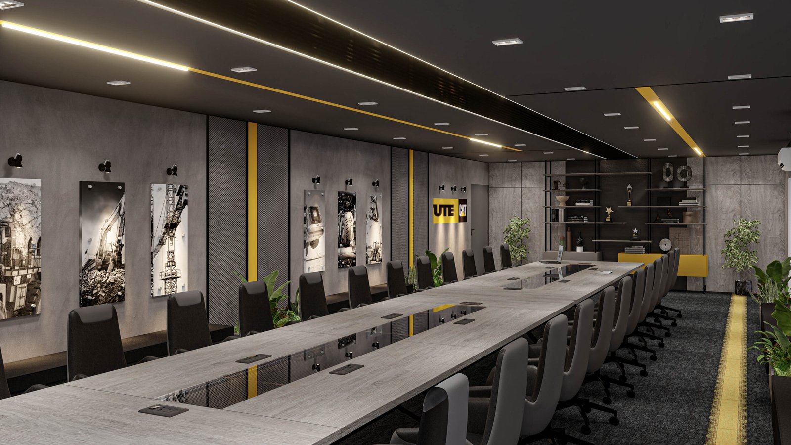 The interior design for United Tractor & Equipment’s boardroom spaces masterfully combines functionality with brand identity, featuring a sophisticated industrial aesthetic that reflects the company’s machinery heritage. The design employs a refined color palette of charcoal gray and concrete tones, dramatically accented with the company’s signature yellow branding elements visible in ceiling recesses, floor borders, and wall details.