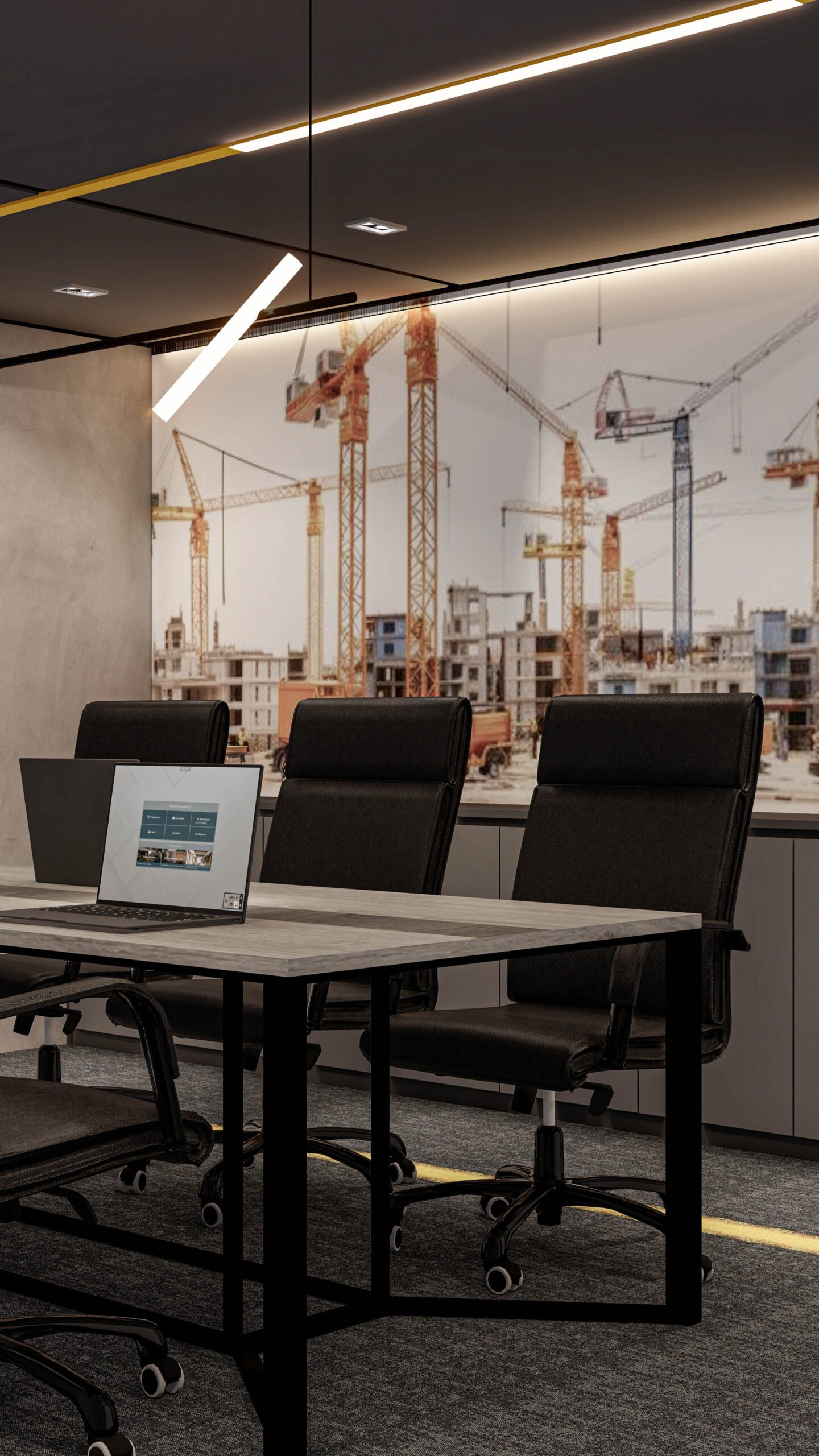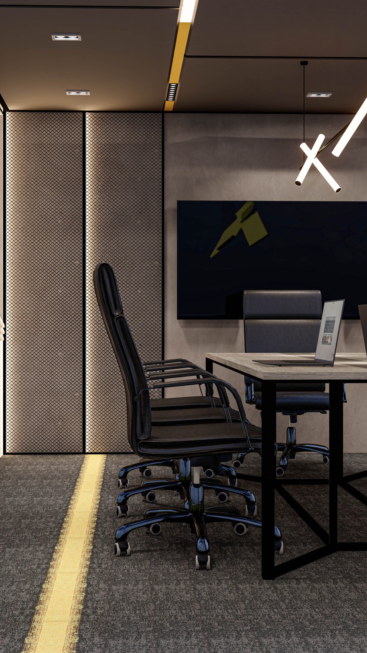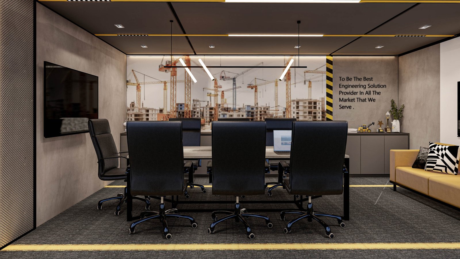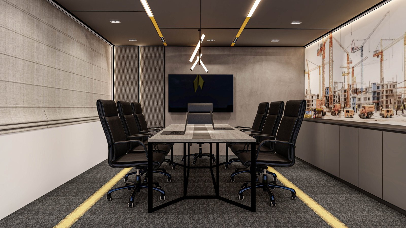 The interior design for United Tractor & Equipment’s boardroom spaces masterfully combines functionality with brand identity, featuring a sophisticated industrial aesthetic that reflects the company’s machinery heritage. The design employs a refined color palette of charcoal gray and concrete tones, dramatically accented with the company’s signature yellow branding elements visible in ceiling recesses, floor borders, and wall details.
