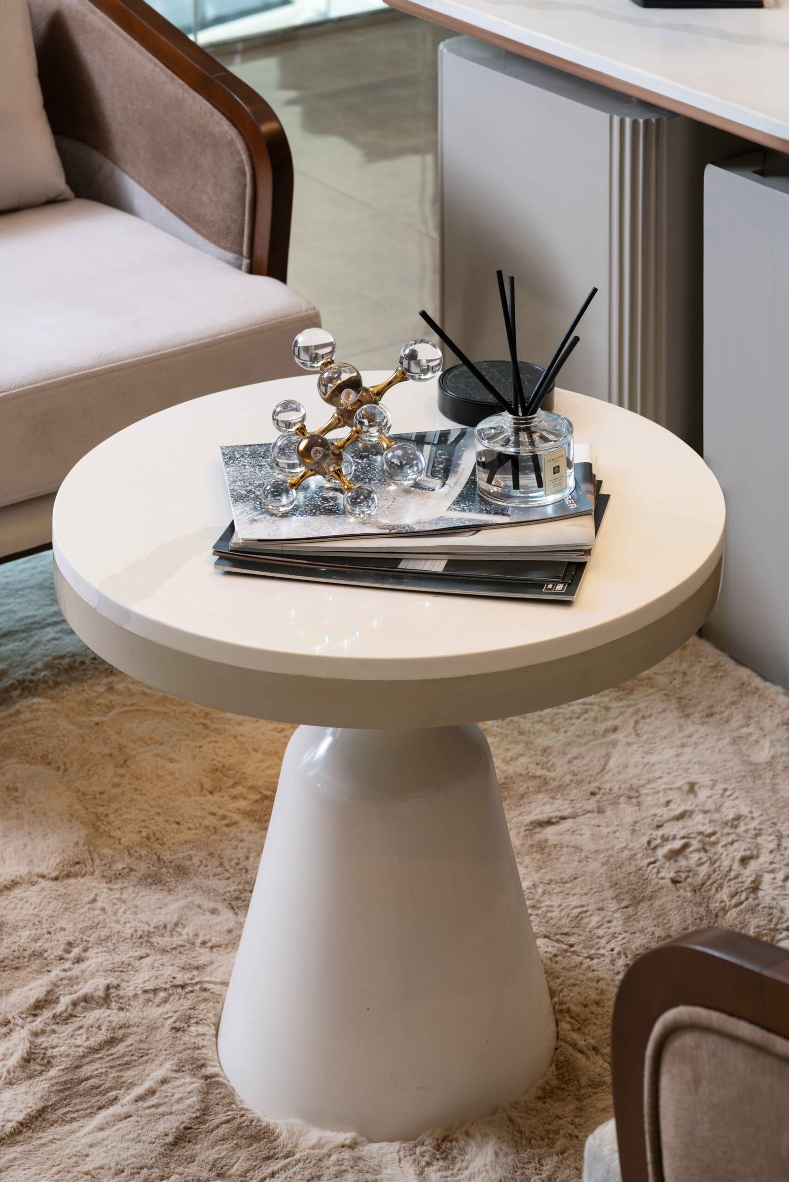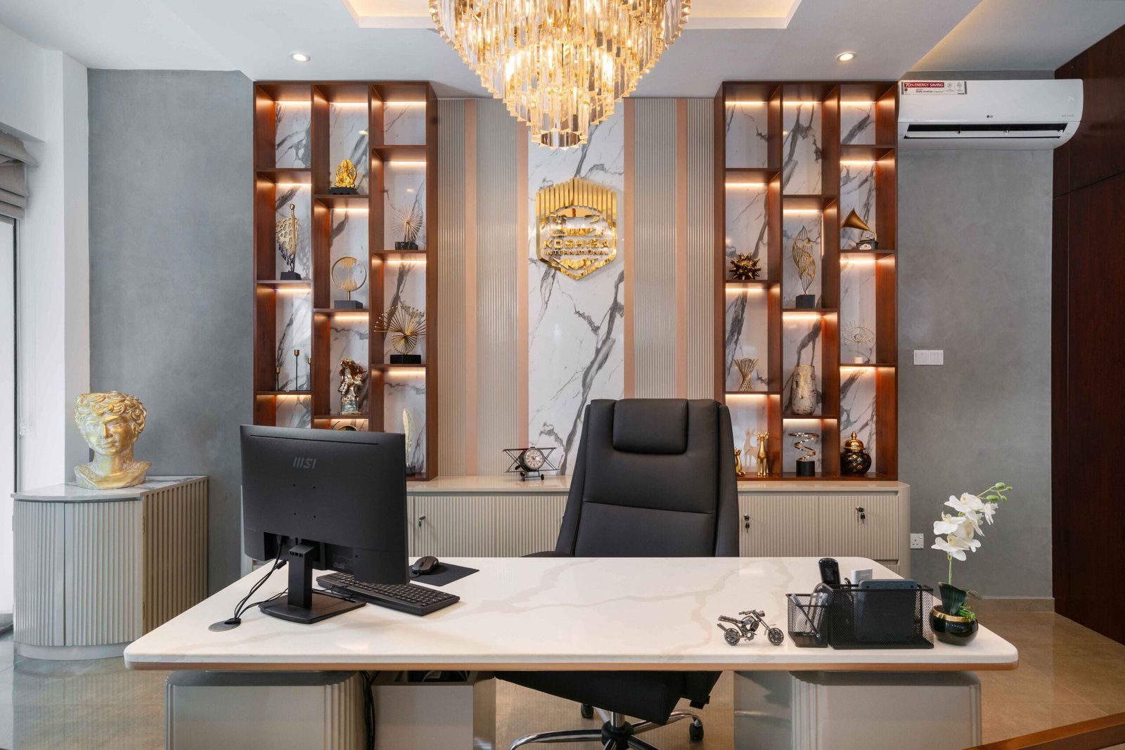 The executive office suite embodies understated opulence. A centerpiece chandelier, marble textures, and soft beige seating harmonize with rich wooden tones and curated decor, reflecting refined taste and authority. Floor-to-ceiling glass allows natural light to pour in while visually connecting the indoors with the lush surroundings.