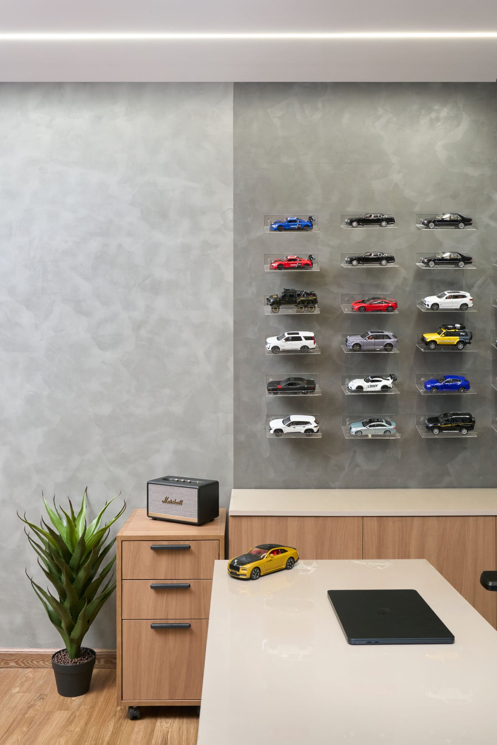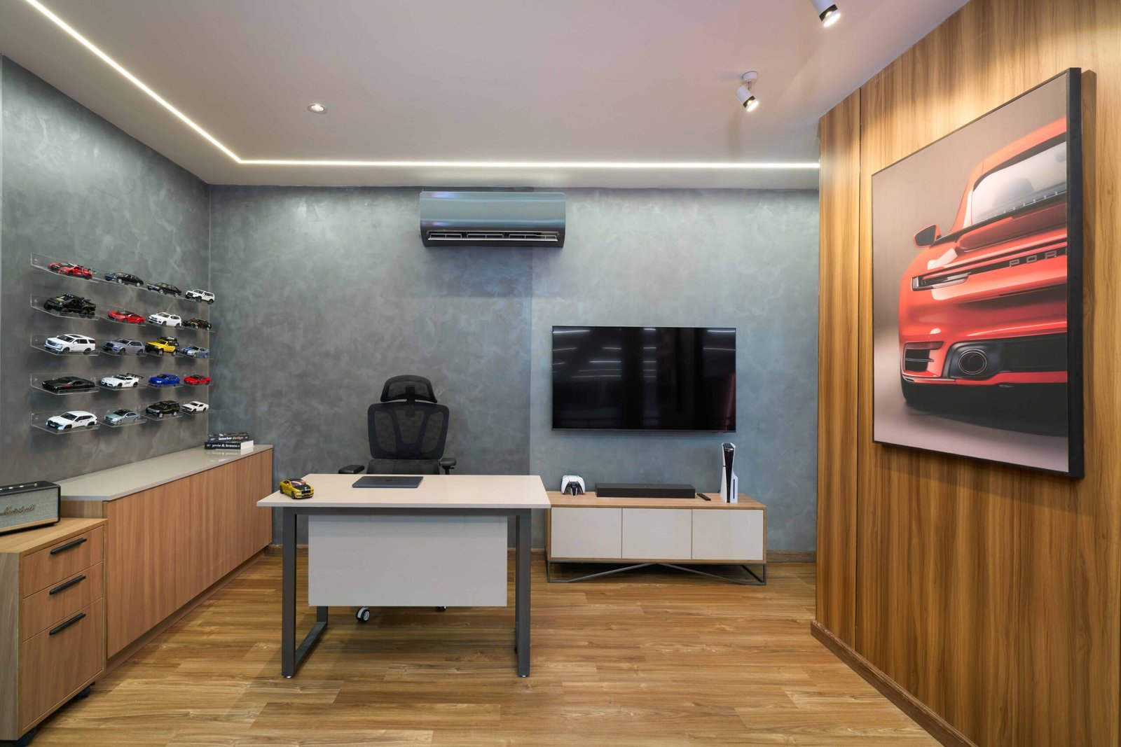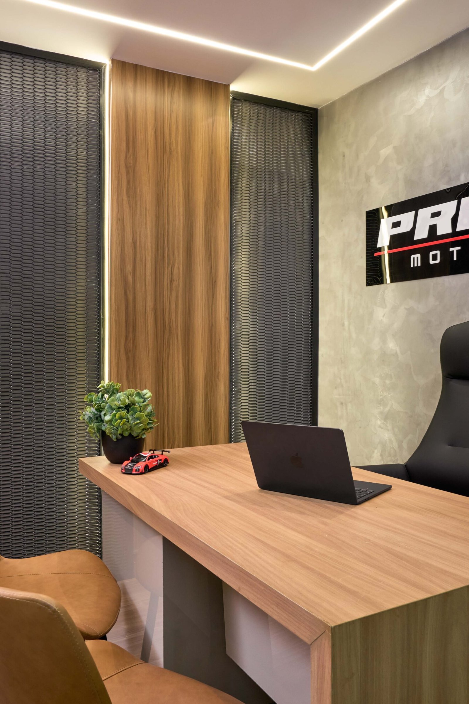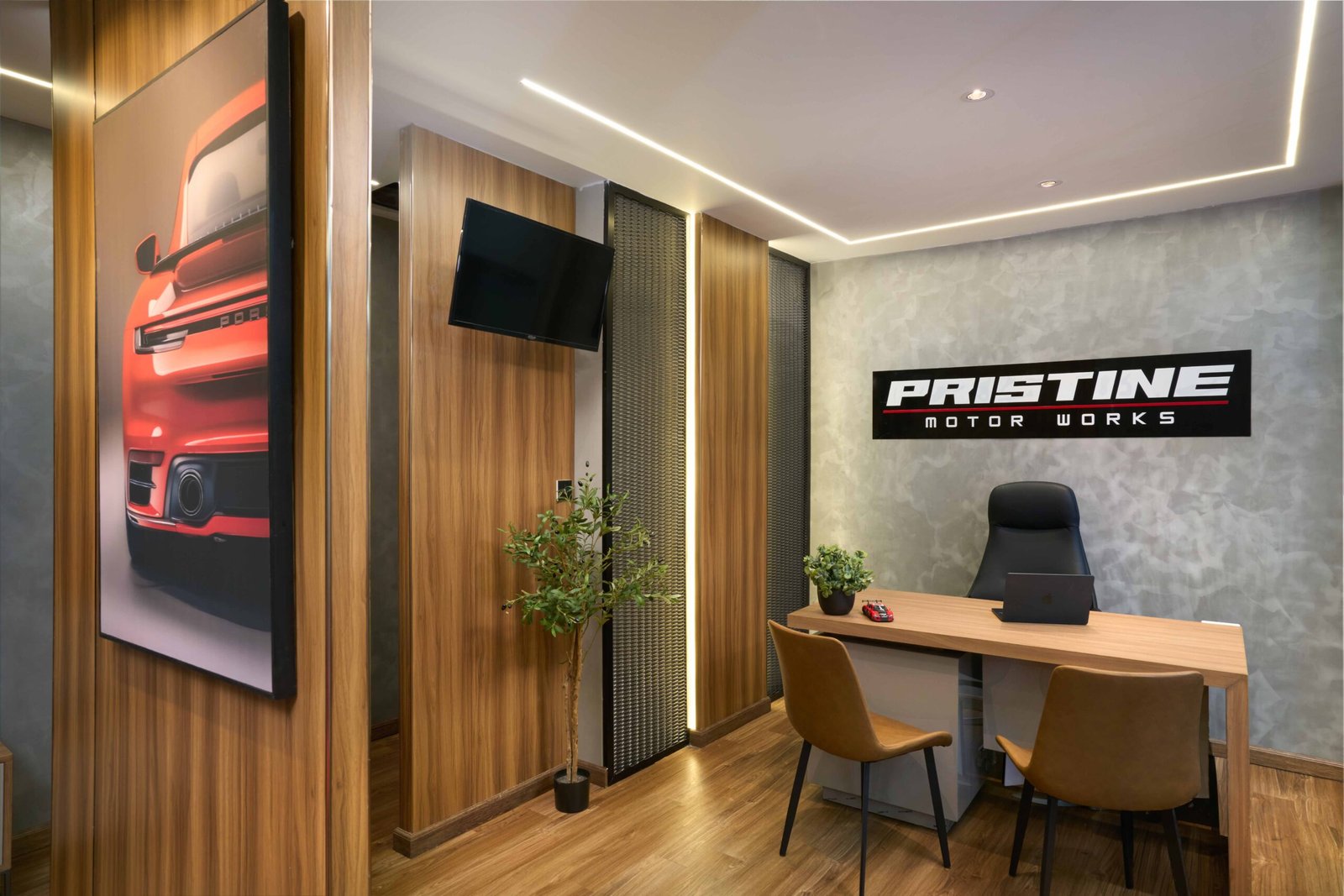 At Interiors by Tharuka, we created a bold and modern showroom that reflects the power and precision of the Pristine brand while redefining the existing building. Cement-textured walls, warm walnut finishes, black mesh accents and dynamic LED lighting work together to build a sleek, high-end atmosphere that celebrates luxury automobiles.
