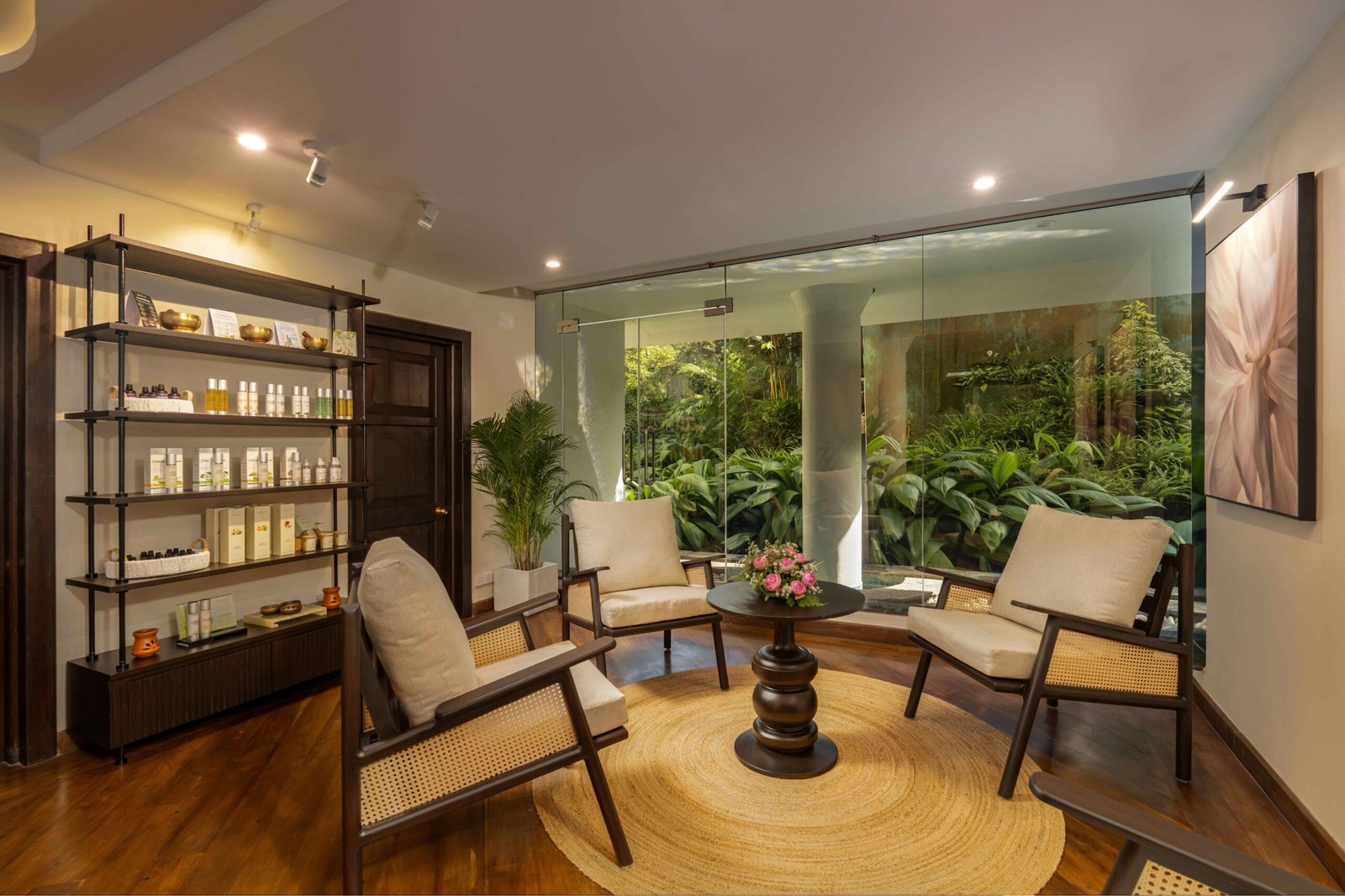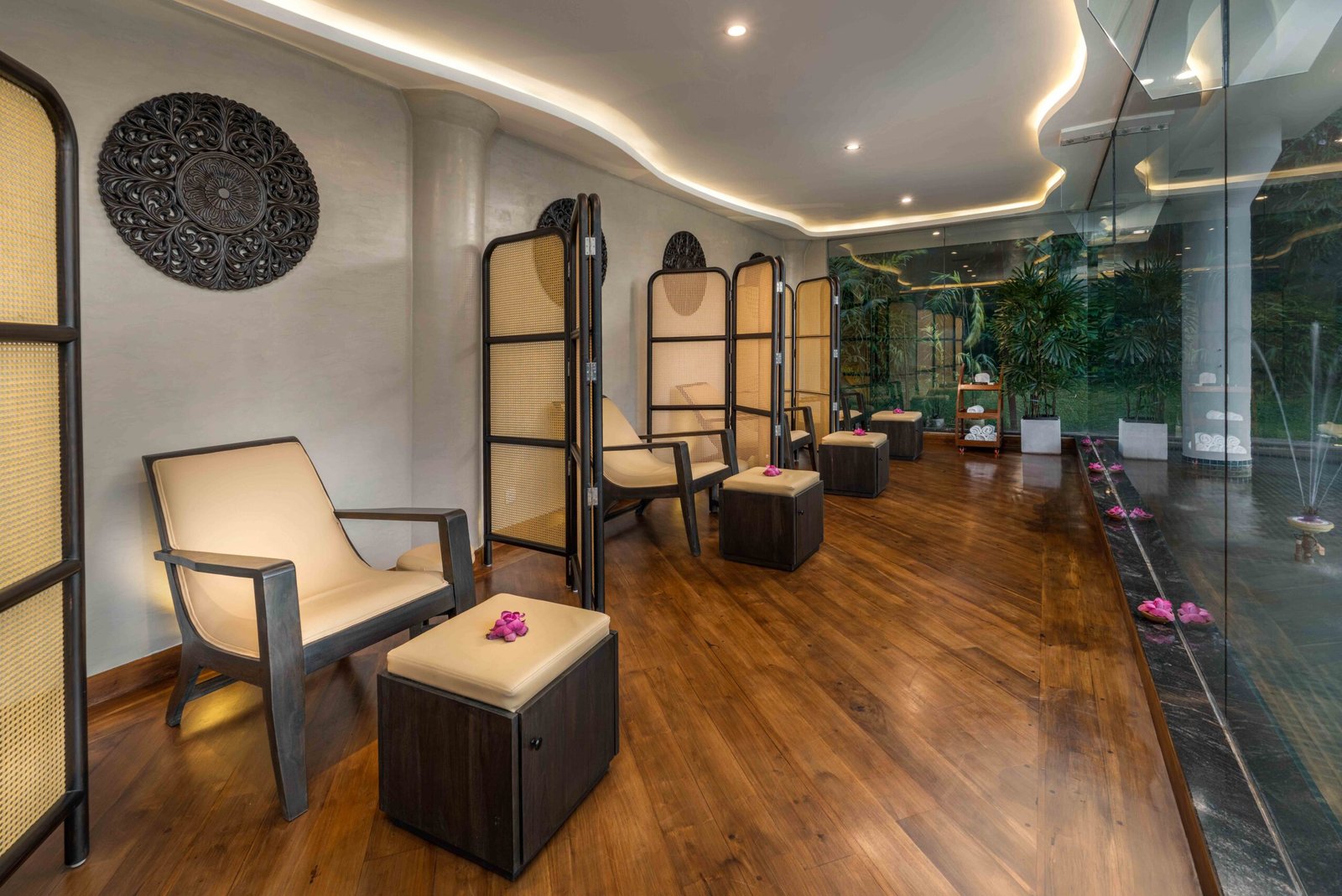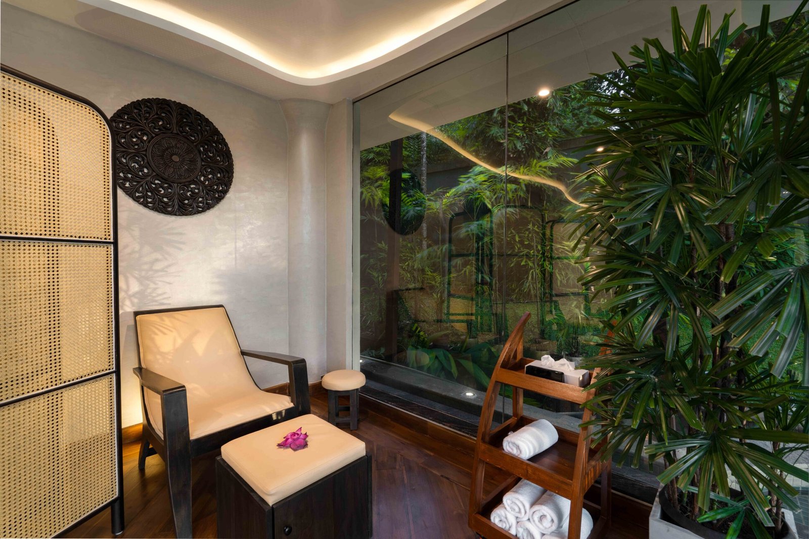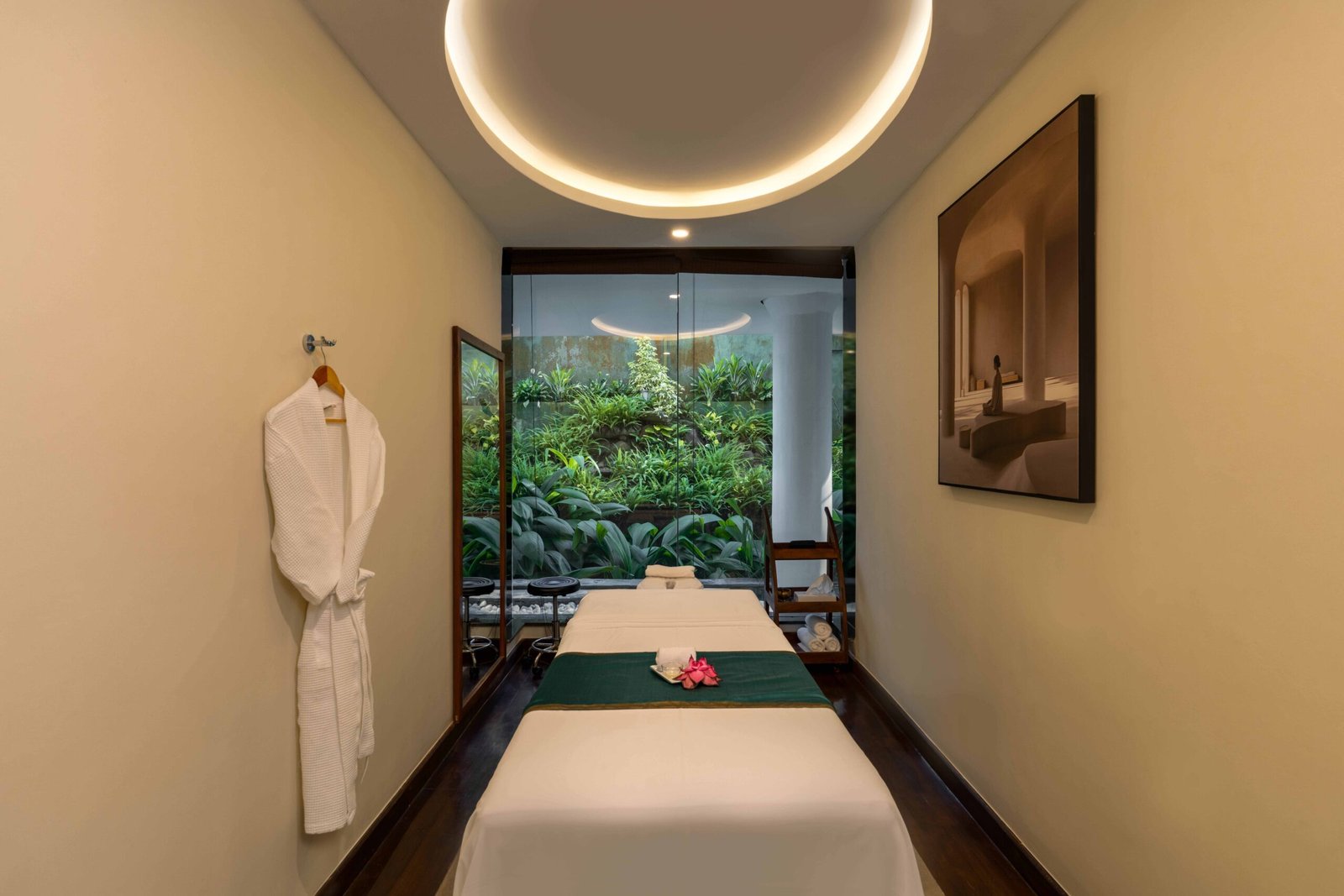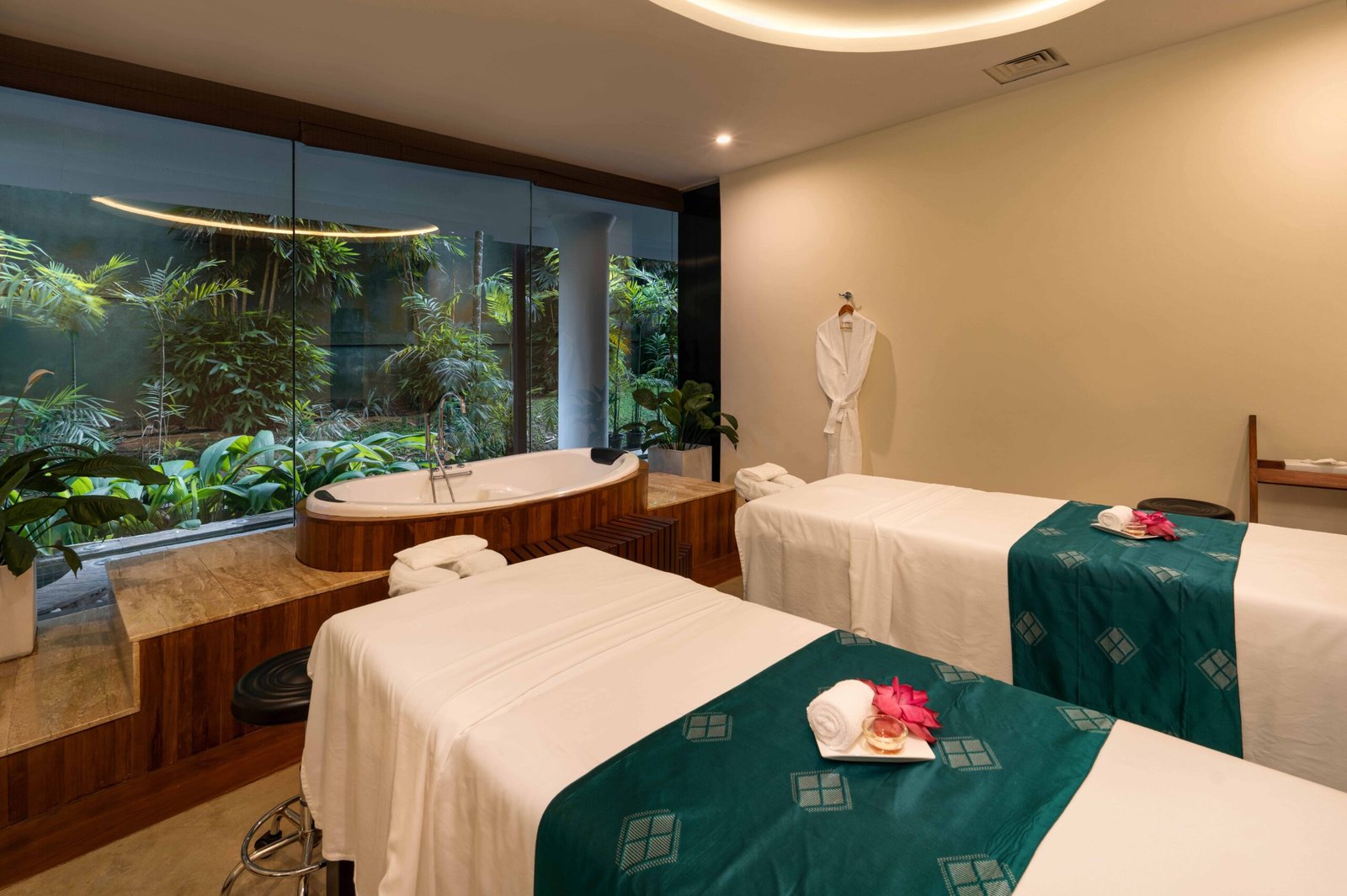 The reception area features bold yet elegant design details: textured art pieces, statement lighting, and botanical accents that greet guests with a sense of refined harmony. Inside the treatment rooms, minimalism meets comfort. Twin massage beds draped in deep green tones reflect the tropical calm outside, while the custom-crafted Jacuzzi corner becomes a focal point of indulgence, framed perfectly by panoramic greenery.