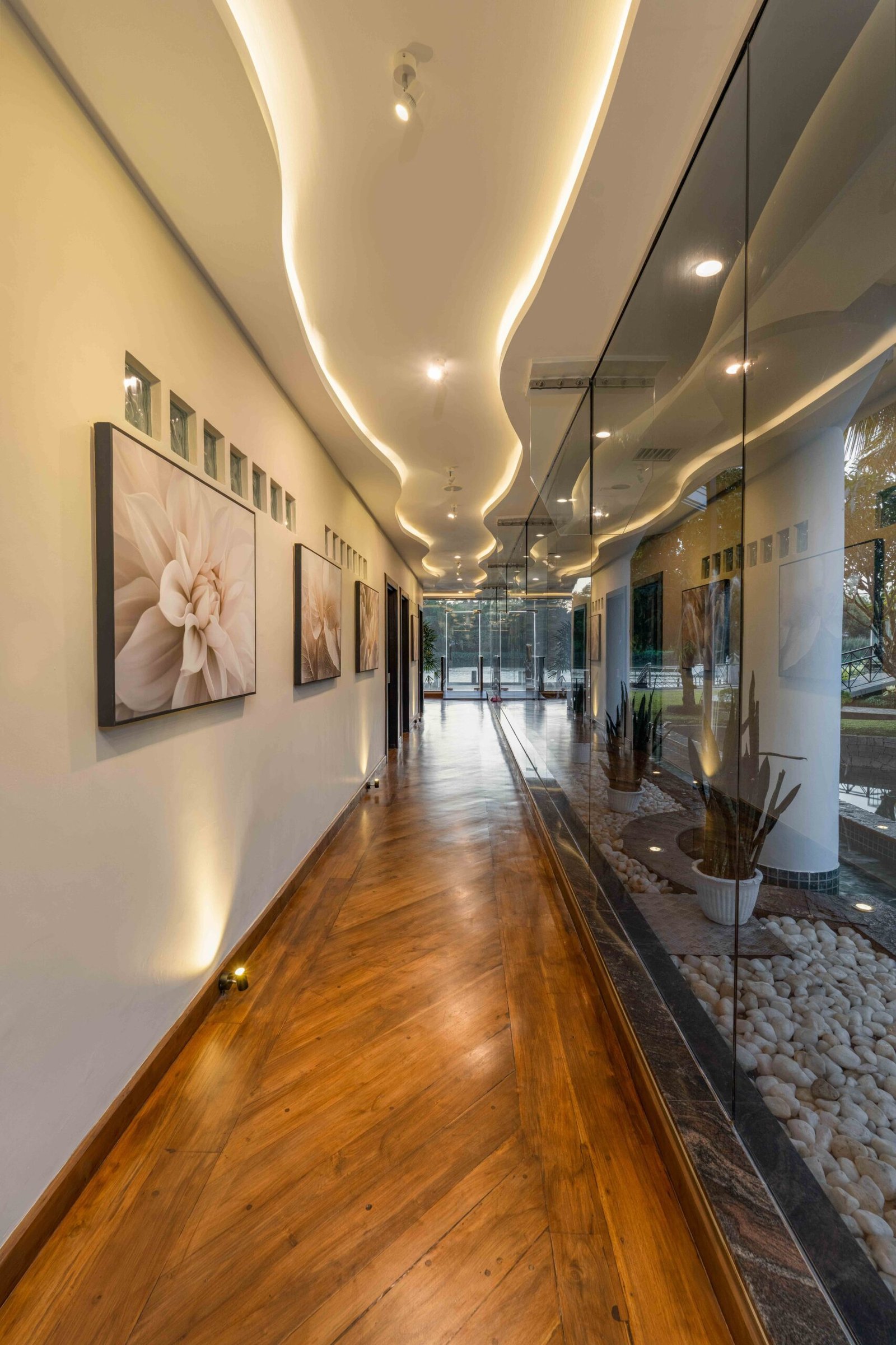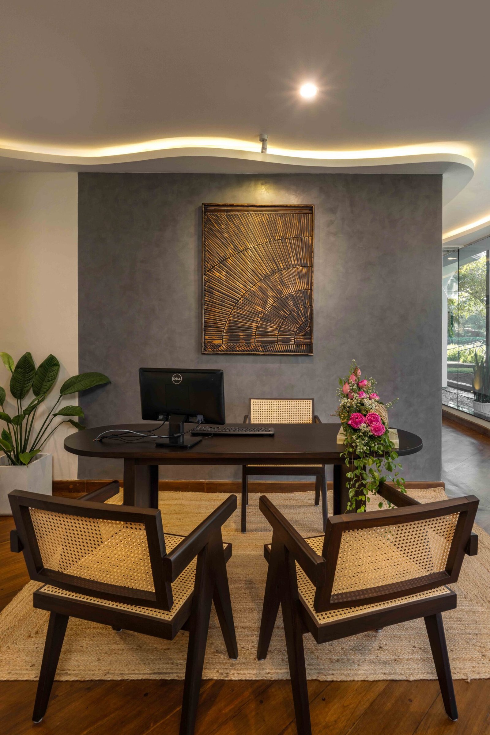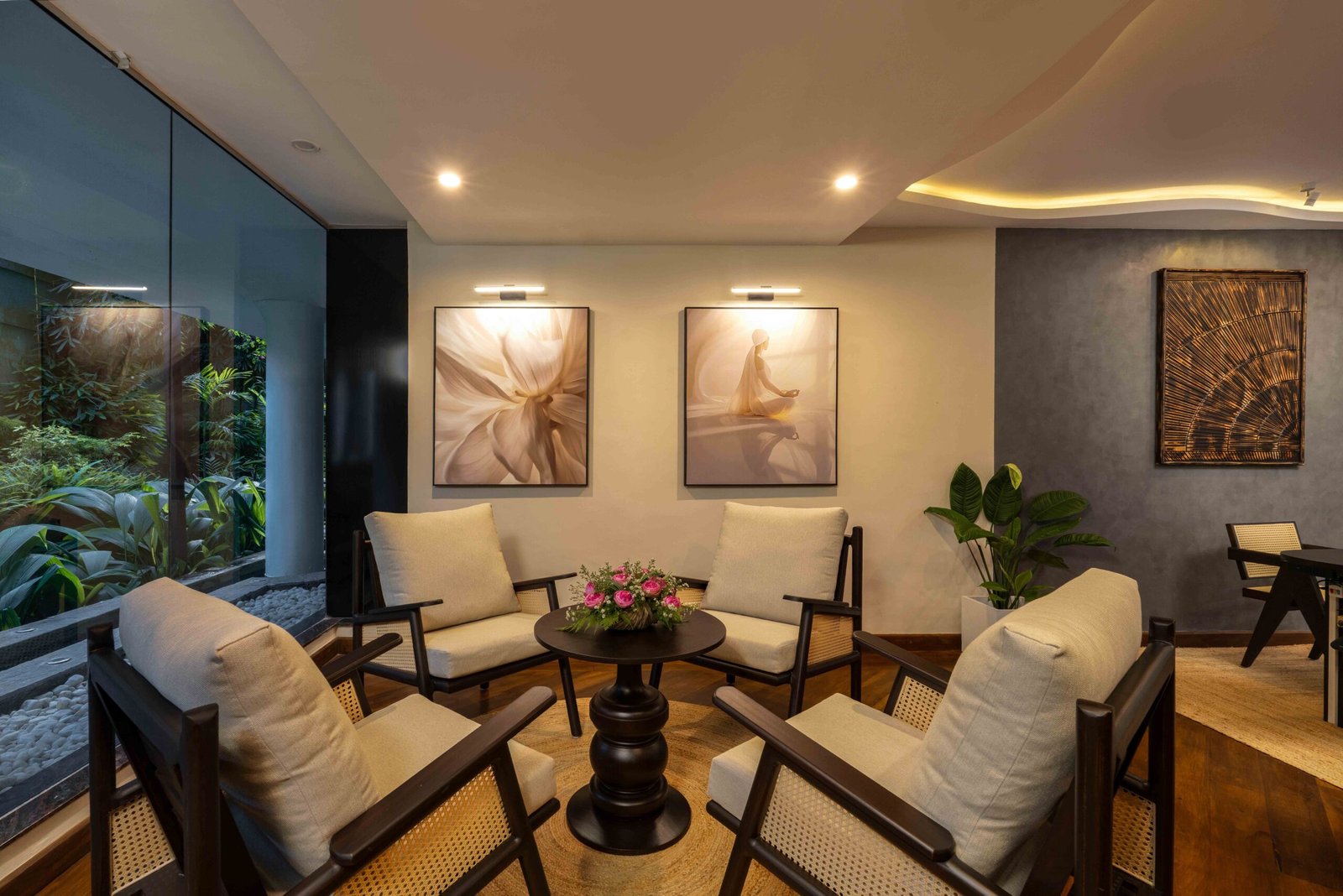 From the moment you step inside, you’re enveloped by a palette of natural warmth, rich wooden floors, soft ambient lighting, and earthy textures that evoke the tranquility of the lush Kandy surroundings. We’ve created private lounge pods featuring woven cane screens and handcrafted furniture, providing guests with a peaceful escape within a shared space. The expansive glass walls invite nature inside, blurring the boundaries between the lush outdoors and the serene indoors.