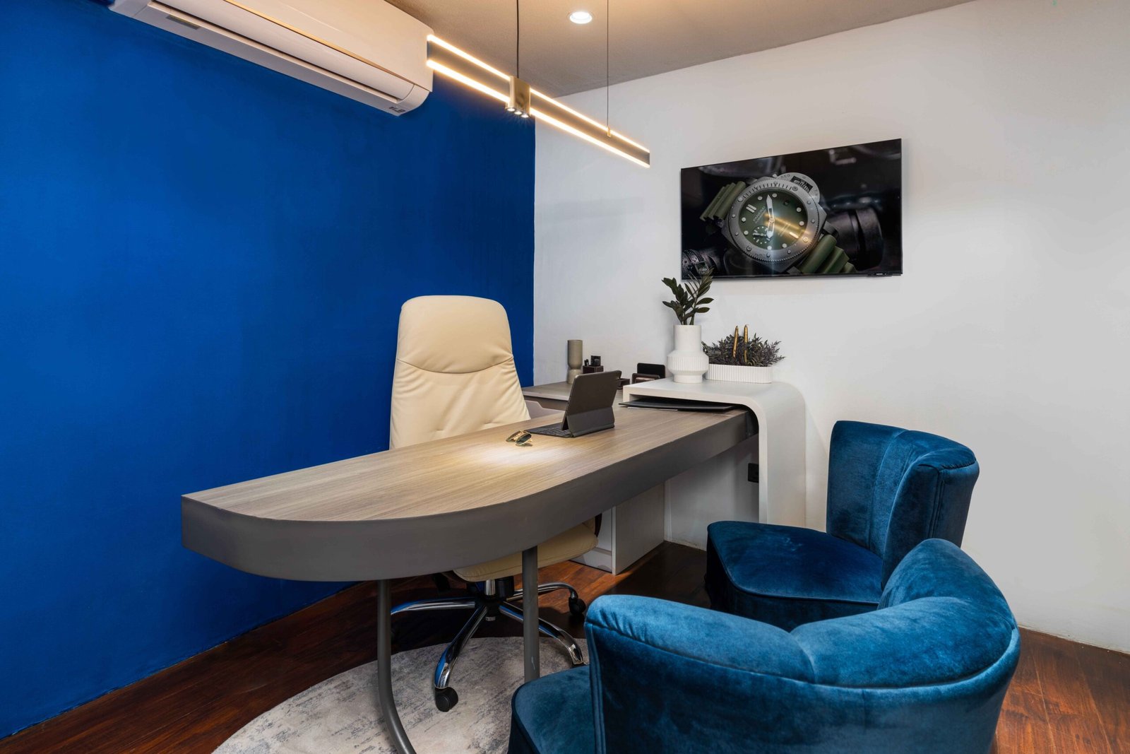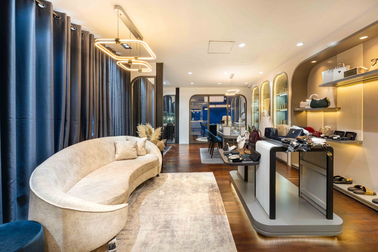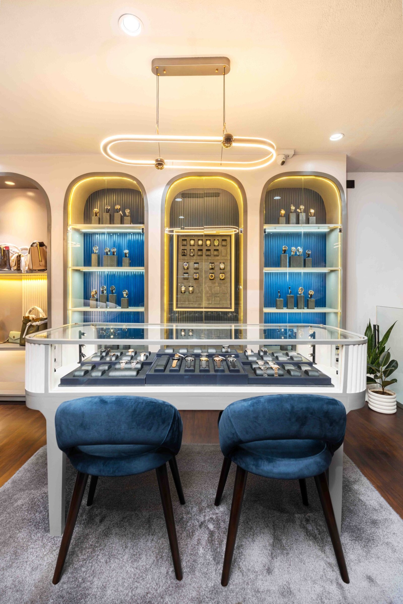 From the moment you walk in, warm wooden floors ground the space in richness and sophistication. Elegant arched niches with golden backlighting showcase curated timepieces like art, while soft velvet seating in deep sapphire adds a luxurious touch for client consultations. Thoughtfully placed lighting highlights every product without overpowering the ambiance, effortlessly balancing form and function.