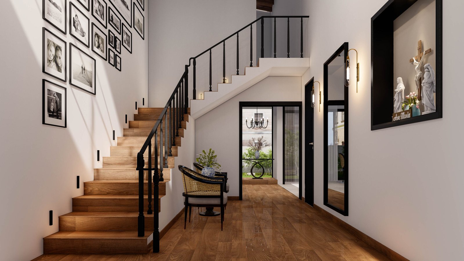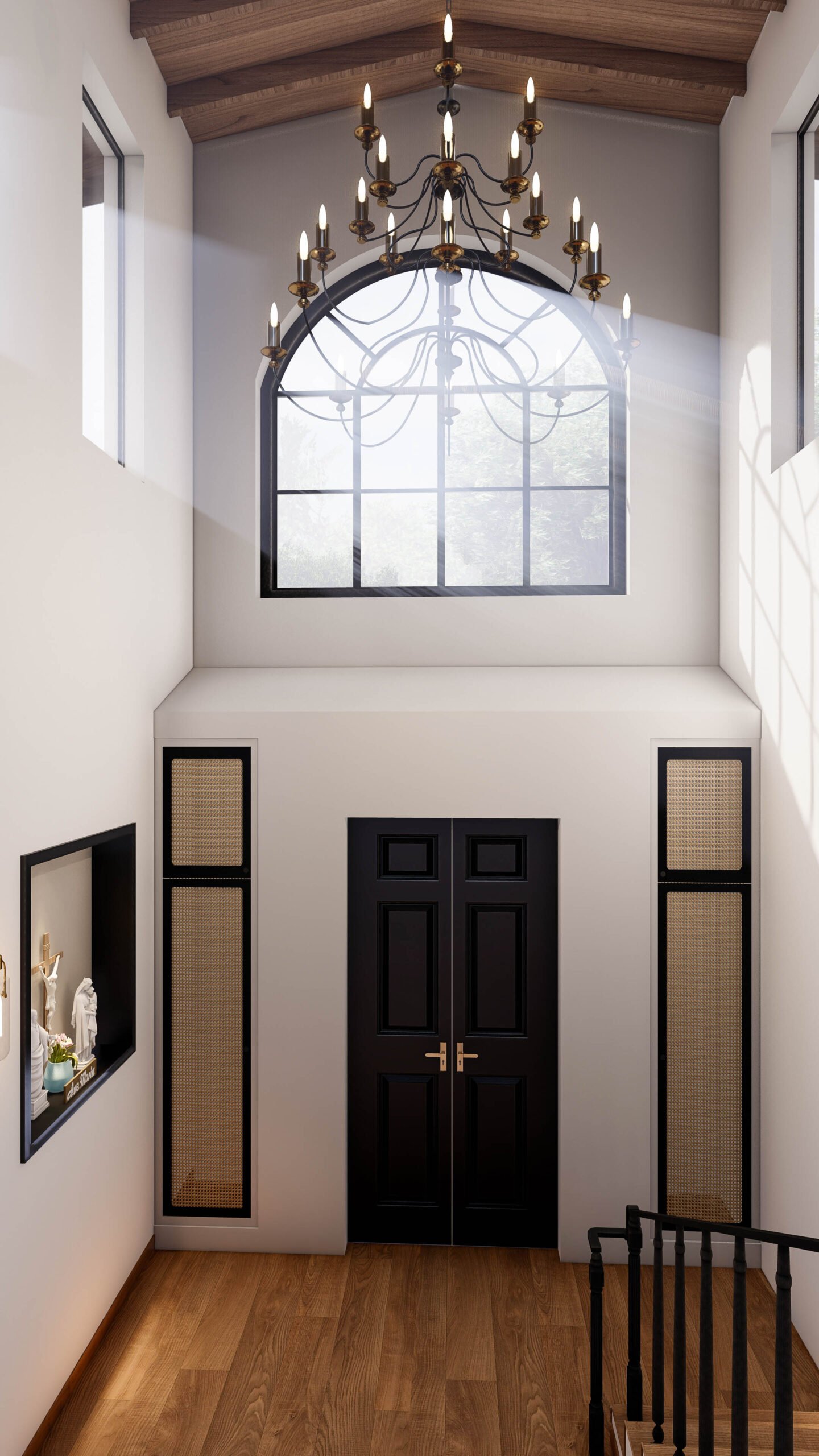 The entryway welcomes you with classic cane paneling, black accents, and a stunning arched window that bathes the space in natural light. A curated gallery wall adds a personal touch, telling stories through timeless black-and-white frames.