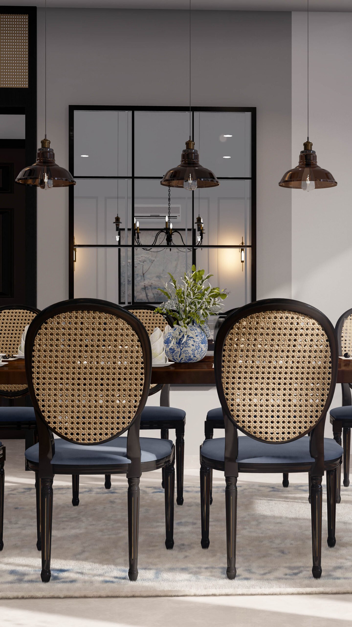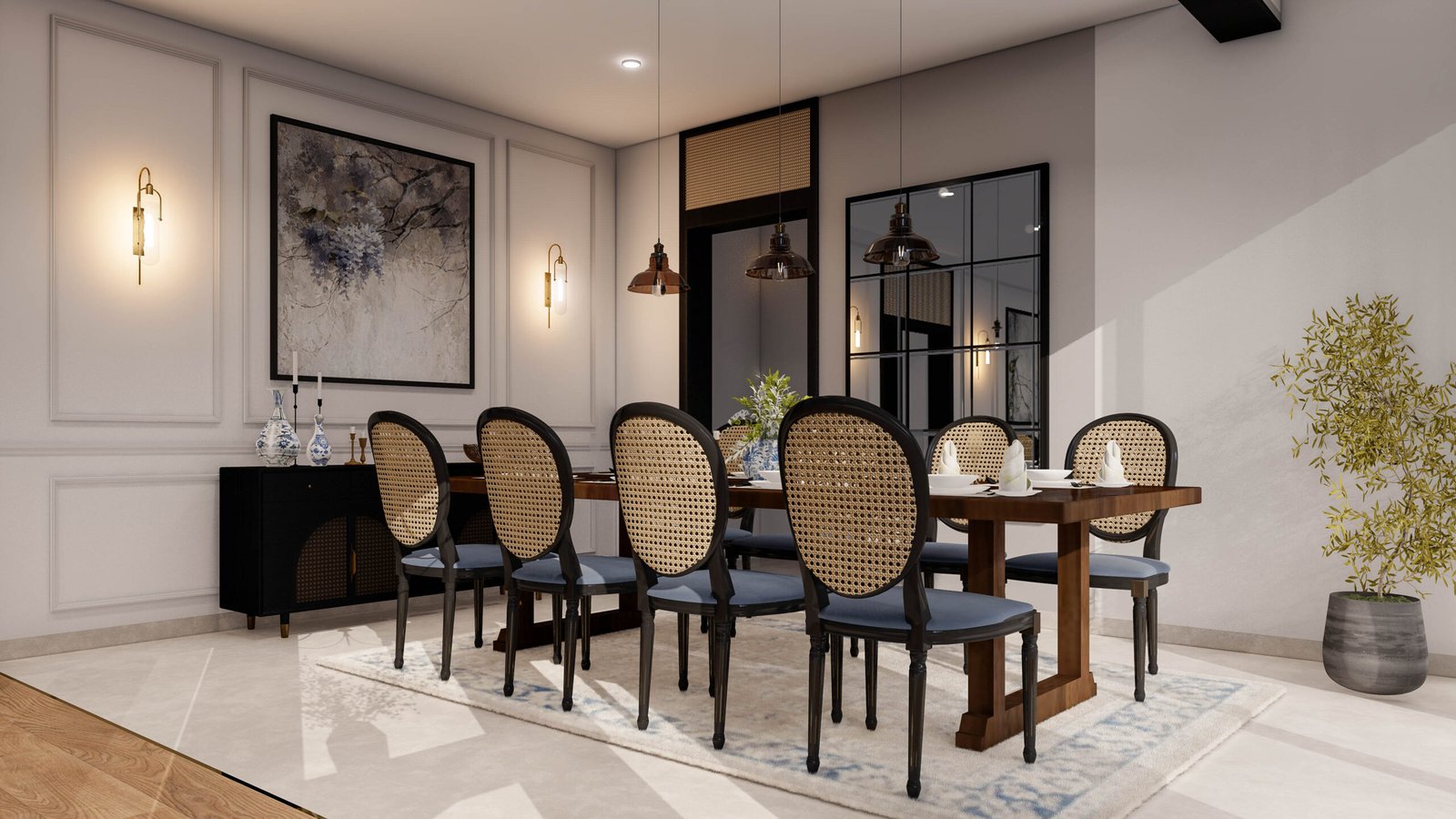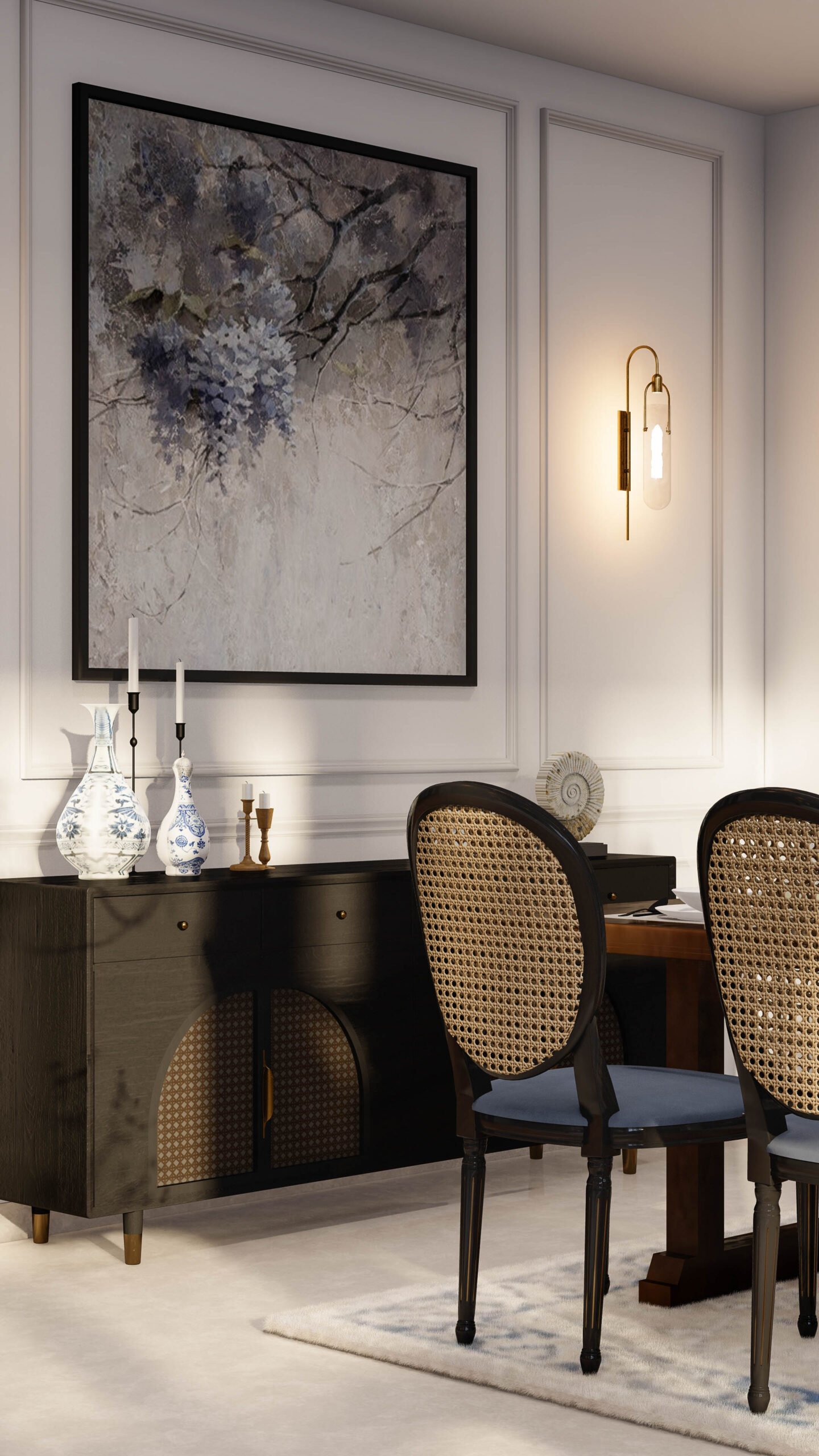 In the living room, soothing neutrals meet rich blues, soft textures, and statement lighting, creating a calm and inviting atmosphere. Every detail, from the wall mouldings to the cushions, was chosen to reflect quiet sophistication. The dining space pairs tradition with style, featuring a custom wooden table, rattan-backed chairs, and warm-toned pendant lights. A perfect setting for heartfelt conversations and everyday living. This project reflects our passion for designing homes with soul, where every corner is thoughtful, functional, and filled with charm.