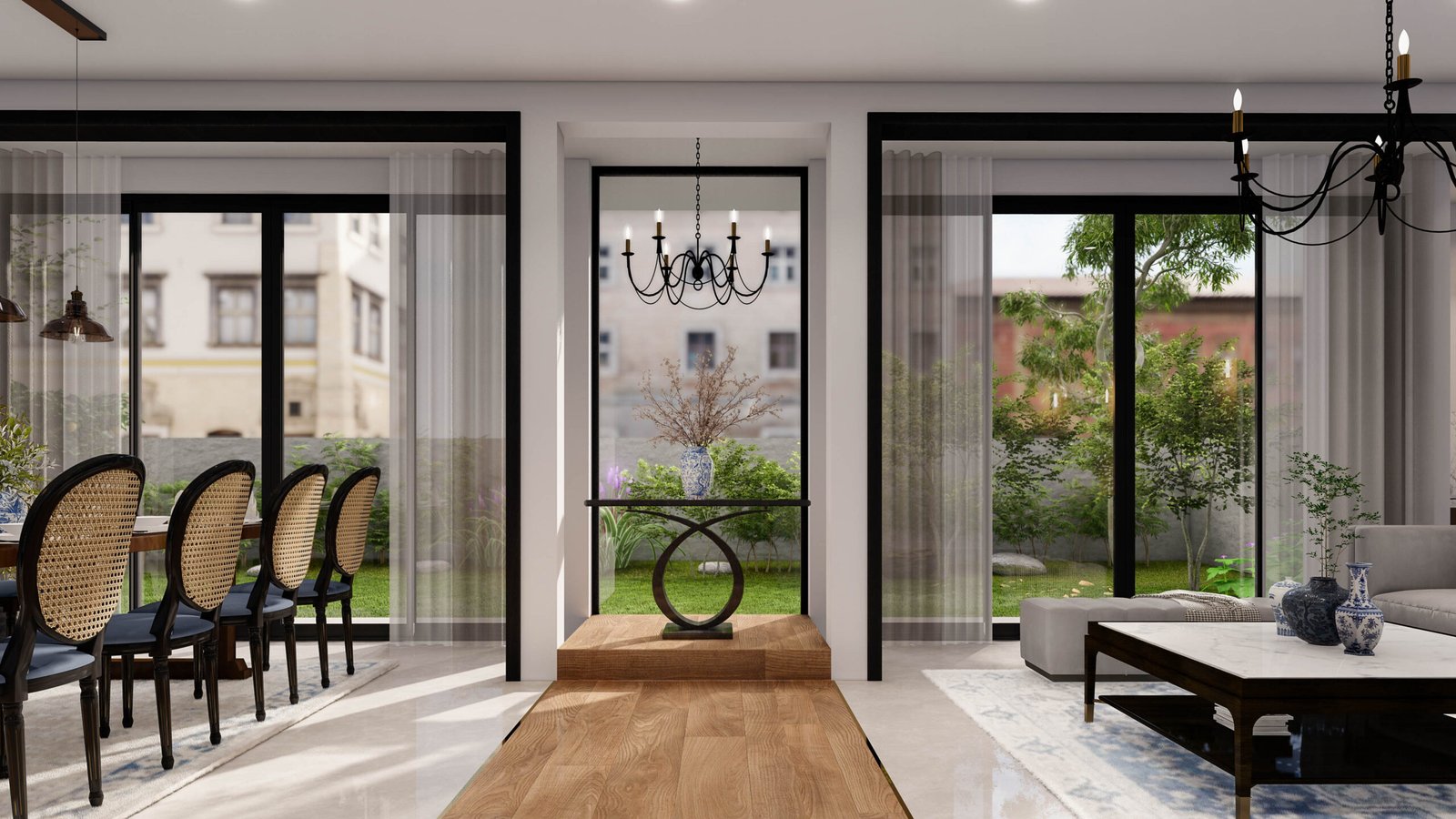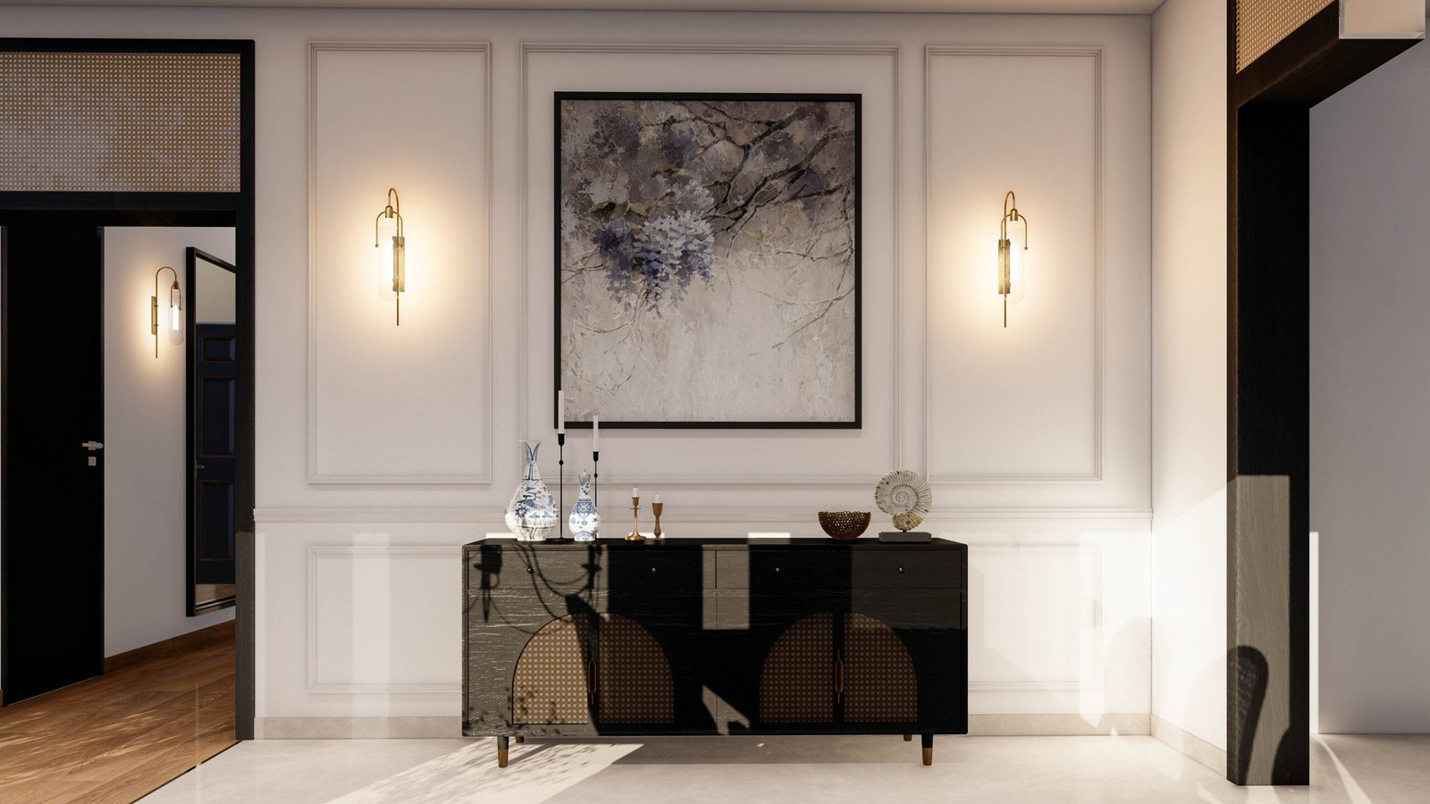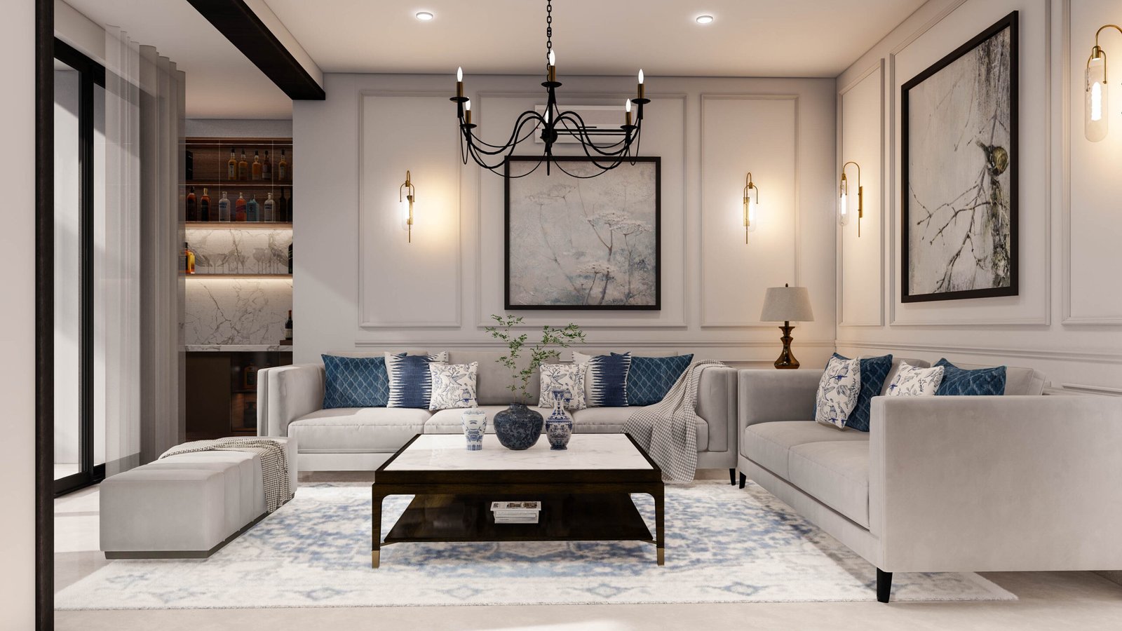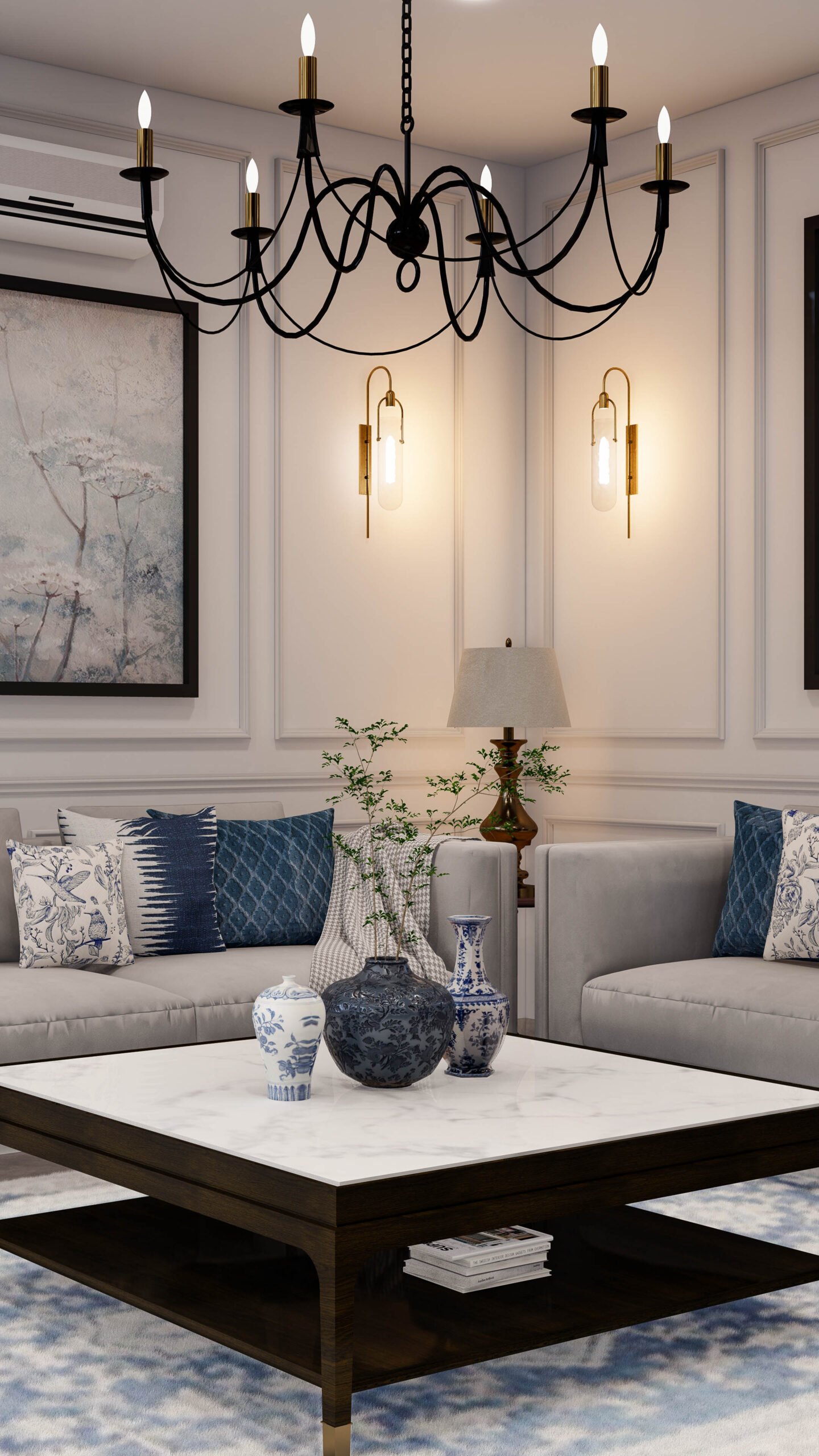 In the living room, soothing neutrals meet rich blues, soft textures, and statement lighting, creating a calm and inviting atmosphere. Every detail, from the wall mouldings to the cushions, was chosen to reflect quiet sophistication. The dining space pairs tradition with style, featuring a custom wooden table, rattan-backed chairs, and warm-toned pendant lights. A perfect setting for heartfelt conversations and everyday living. This project reflects our passion for designing homes with soul, where every corner is thoughtful, functional, and filled with charm.